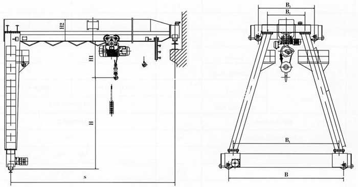 1. BMH electric hoist semi gantry crane and CD, MD, HC and other models of electric hoists are used together. It is a light rail operated small crane used in both indoor and outdoor spaces and windy areas, with a lifting capacity of Gn=2t-10t, a span of 10m-30m, a working environment below+40 ℃, a working level of 25%, and a wind pressure not exceeding 125Pa.