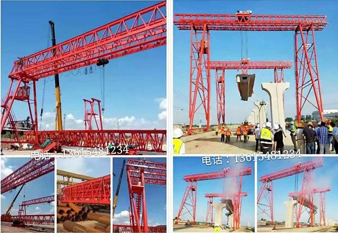 提梁機既可兩臺配合抬吊預制梁,也可以單臺起重機配雙吊具起吊預制梁,兩臺同時起重的提梁機各自的起重量一般為450噸,單臺起重的提梁機起重量通常可達900噸。它配置支腿行走、天車行走及天車起吊設備,可以實現機械化動作。主要用于將預制梁從制梁臺提吊至存梁臺位,預制梁養護完成后將其從存梁臺位吊運到運梁車上。作為起重設備完成架橋機的組裝和拆卸。還用于架設墩身不高的旱橋。